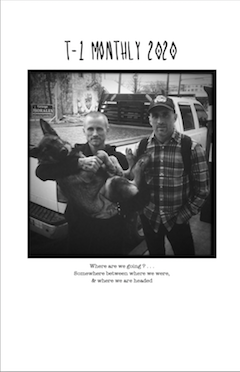 “ T-1 Monthly “ was an idea that came from a creative challenge put into motion. The goal was for each month, to fill a fold out page which would have print on both sides, when then would be added in with that current month’s online store orders. The content on the page had no guidelines what so ever. It stood to be a gathering of photos, drawings, stories, ideas, and random thoughts . . . Basically It could be anything! It would exist so that I some time could be set aside to just let go, and enjoy the creative process, however it showed up on that day. It was a pretty simple concept. And at the end of the year, I would have this collection of pages from the past months. So, I put them all together, would fill in a few more pages for the fun of it, make a zine, and get it printed on some better paper. We did 2 zines from the collections of 2020, & 2021, which you can see here . . . I think it might be time for T-1 Monthly 2026 to begin . . . – Joe